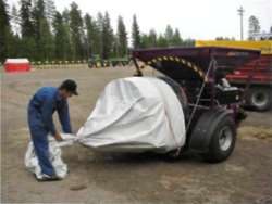 12. Если упаковку/плющение по какой-то причине придется приостановить, достаточно остановить вальцовую мельницу Murska Мурска. Давление тормозов трогать не надо. Когда упаковка Murska Мурска опять продолжится, получится единый и ровный рукав без провисов или слишком толстых мест. 13. Когда работа по упаковке заканчивается, сначала закрываете подачу зерна на мельницу Murska Мурска, оставшееся на вальцах зерно пропускается через вальцы, и останавливаете мельницу Murska Мурска. Спускаете давление в тормозах, и трактор медленно проезжает вперед на 2-3 м, чтобы высвободить пустой конец рукава. 14. Рукав Murska Мурска отрезается, и пустая часть рукава Murska Мурска плотно скручивается, например, на доску в сторону заполненного рукава. Если в конце рукава останется воздух, можно проделать в рукаве маленький надрез и выдавить воздух. Надрез сразу заклеивают поставляемым с рукавом скотчем для заплат.